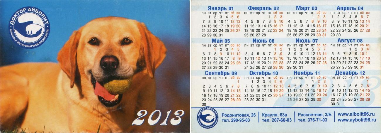 Карманный календарик "г.Екатеринбург. Ветеринарная клиника «Доктор Айболит». 2013 г."