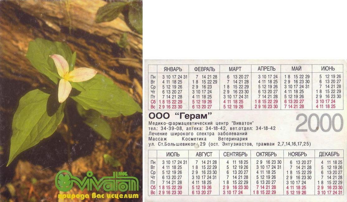 Карманный календарик "г.Екатеринбург. Медико-фармацевтический центр «Виватон». 2000 год."