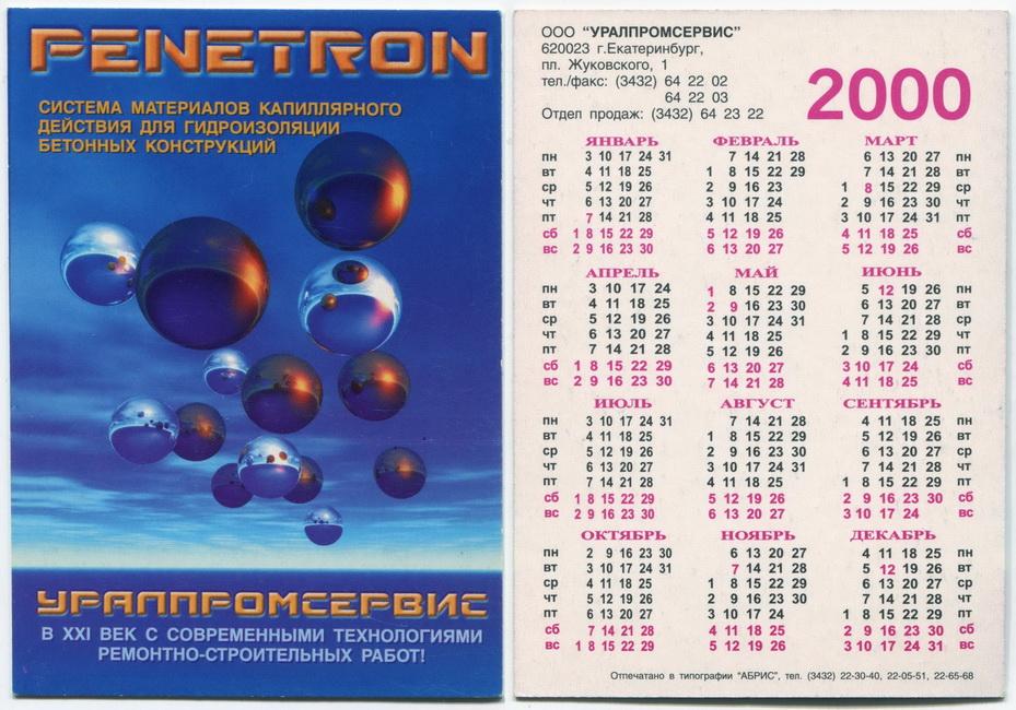 Карманный календарик "г.Екатеринбург. ООО «Уралпромсервис». 2000 г."