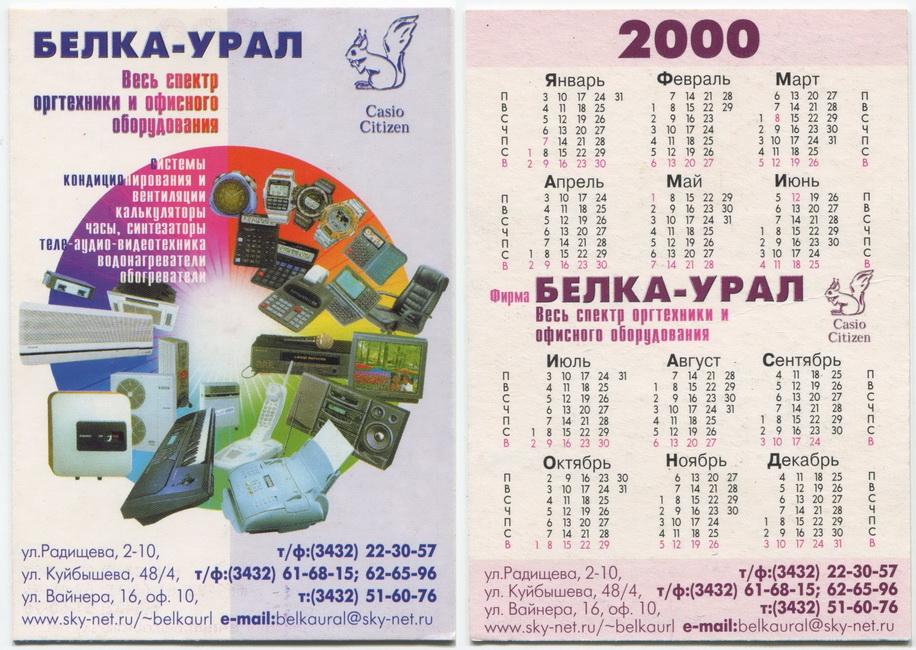 Карманный календарик "г.Екатеринбург. Фирма «Белка-Урал». 2000 г."