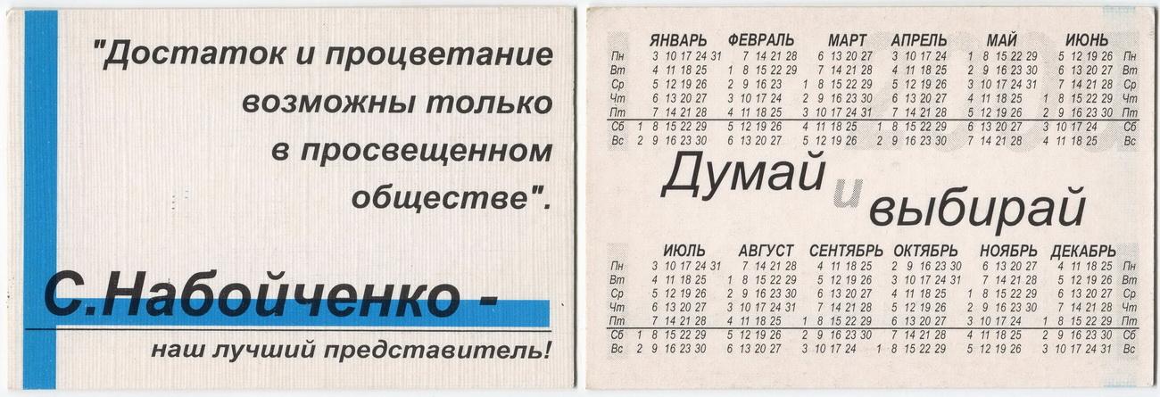 Голосуй за нашего ректора Набойченко С.! Материал: картон. Размер: 100х69 Календарик не ламинирован. Отп. ООО "Издательство УМЦ УПИ". Екатеринбург, ул. Мира, 17 по заказу Набойченко Станислава Степановича. Тираж 5000. Заказ 54 от 17.03.2000 |