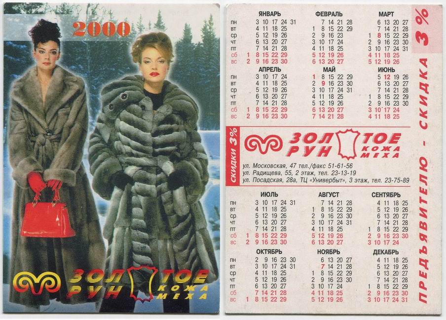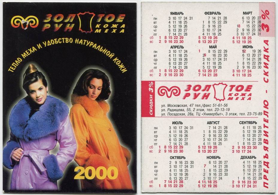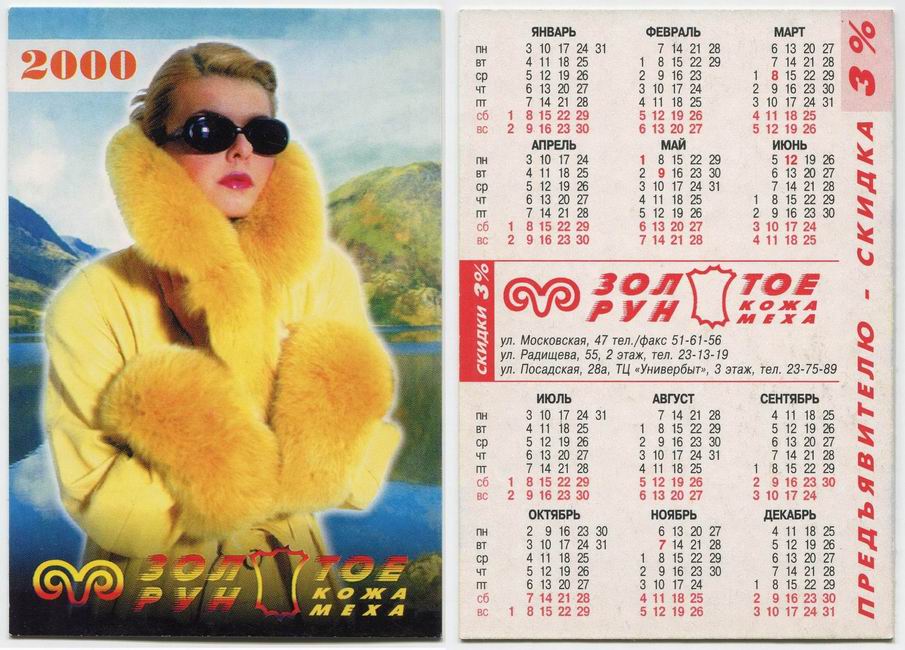 Карманный календарик "г.Екатеринбург. Сеть магазинов кожи и меха «Золотое Руно». 2000 г."