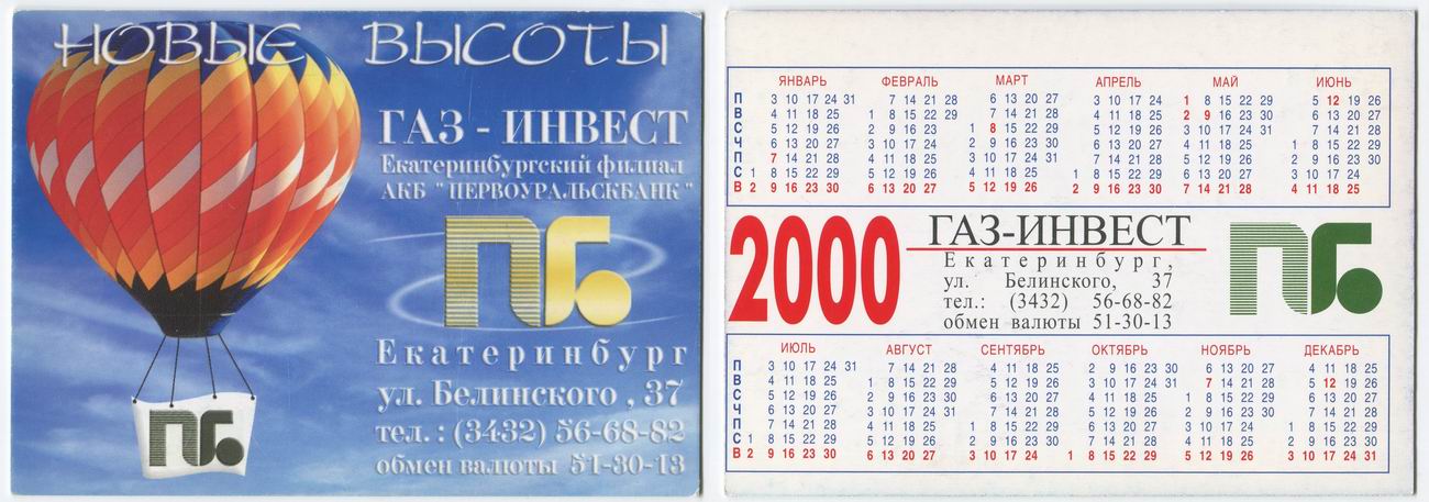 Карманный календарик "г.Екатеринбург. Банк «Газ-Инвест» Екатеринбургский филиал АКБ Первоуральскбанк». 2000 г."