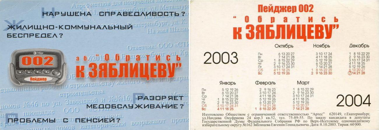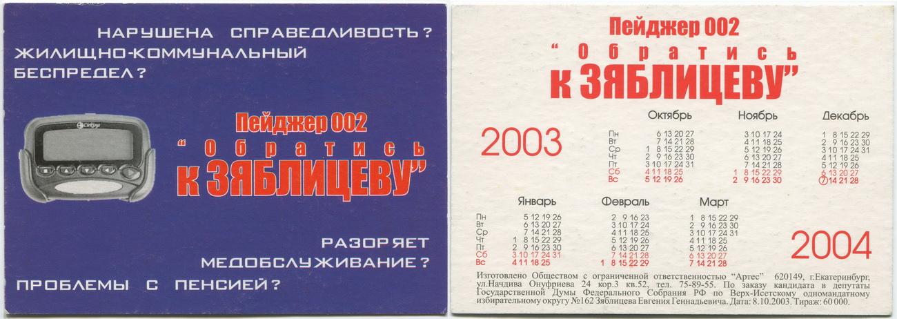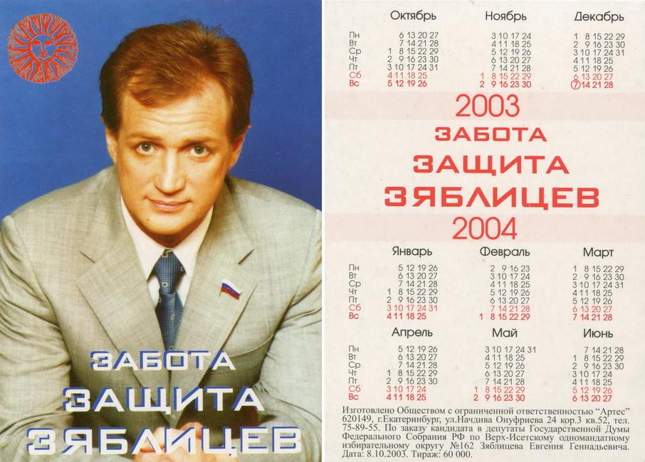 Карманный календарик "Выборы в Государственную Думу РФ. Верх-Исетский избирательный округ № 162. Зяблицев Е.Г. 2003-2004 гг."