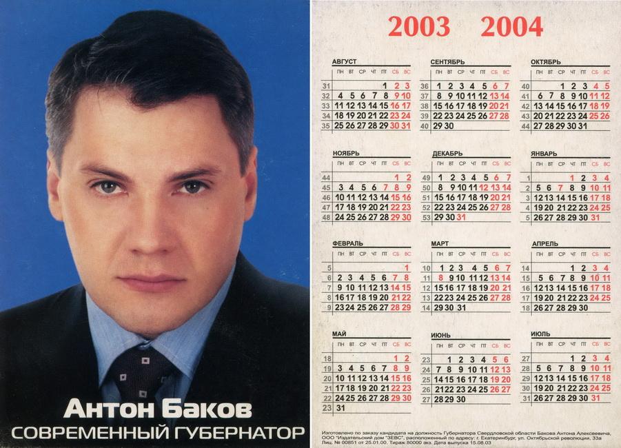 Карманный календарик "Выборы Губернатора Свердловской области. Баков А.А. 2003-2004 гг."