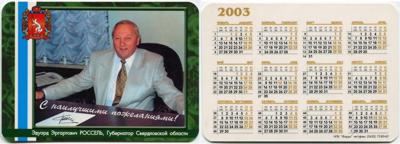 Карманный календарик "Губернатор Свердловской области Россель Э.Э. 2003 г."