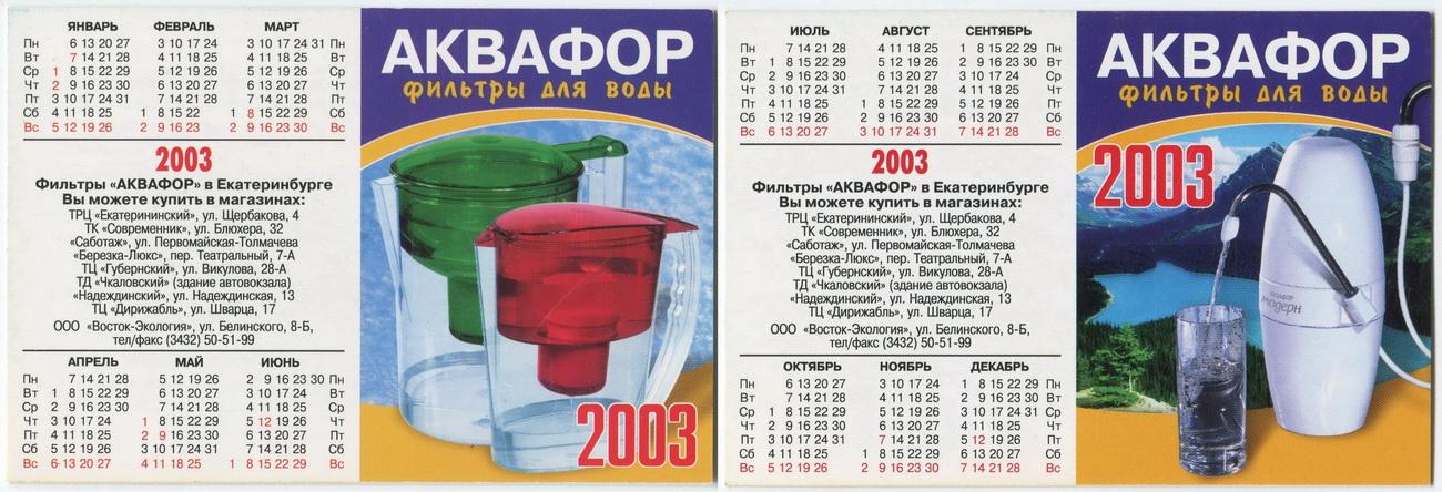 2-створчатый карманный календарик "г.Екатеринбург. Фильтры для воды «Аквафор». 2003 г."