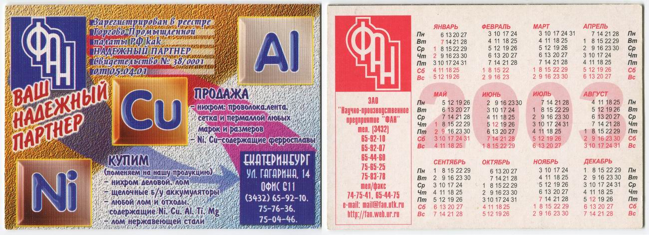 Карманный календарик "г.Екатеринбург. ЗАО "Научно-производственное предприятие «ФАН»". 2003 г."