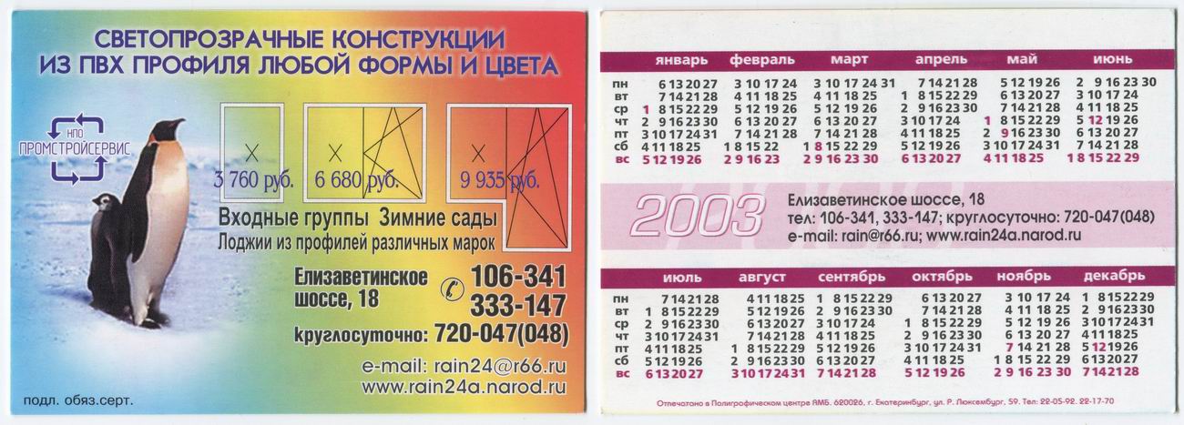 Карманный календарик "г.Екатеринбург. НПО «Промстройсервис». 2003 г."