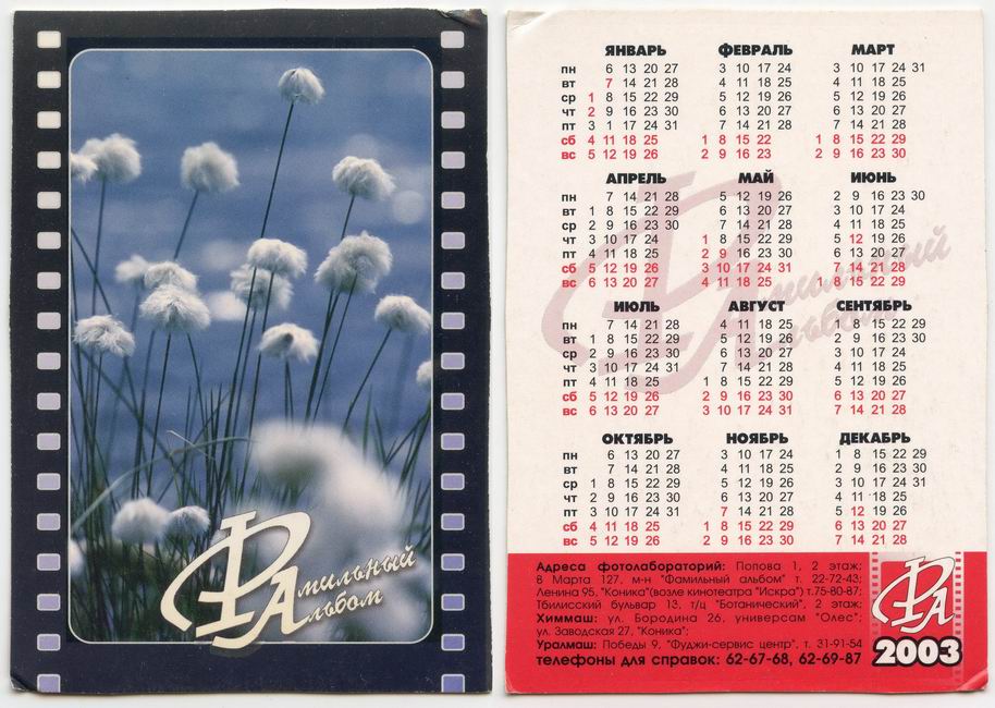 Карманный календарик "г.Екатеринбург. Сеть фотосалонов «Фамильный альбом». 2003 г."