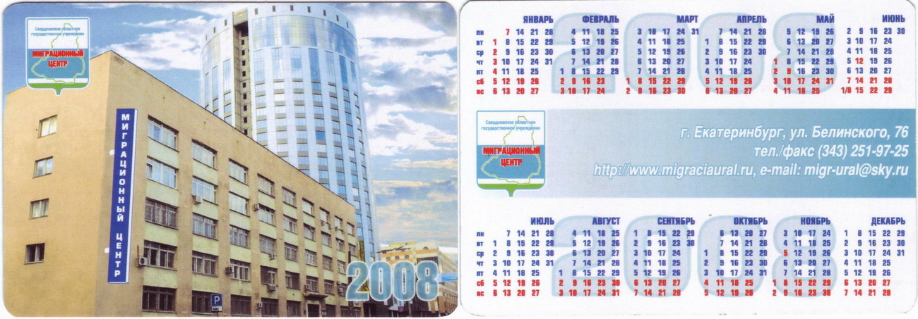 Карманный календарик "г.Екатеринбург. Миграционный центр Свердловской области. 2008 г."