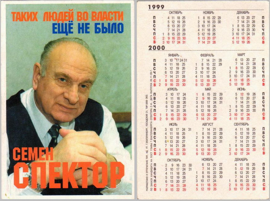 Карманный календарик "г.Екатеринбург. Выборы. Семён Спектор. 1999-2000 гг."