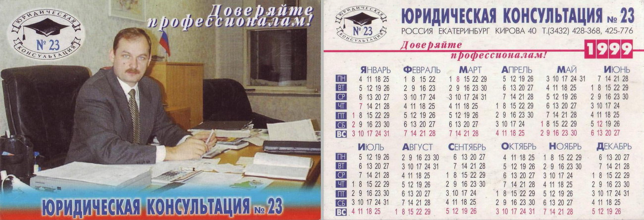 Карманный календарик "г.Екатеринбург. Юридическая консультация №23. 1999 год."
