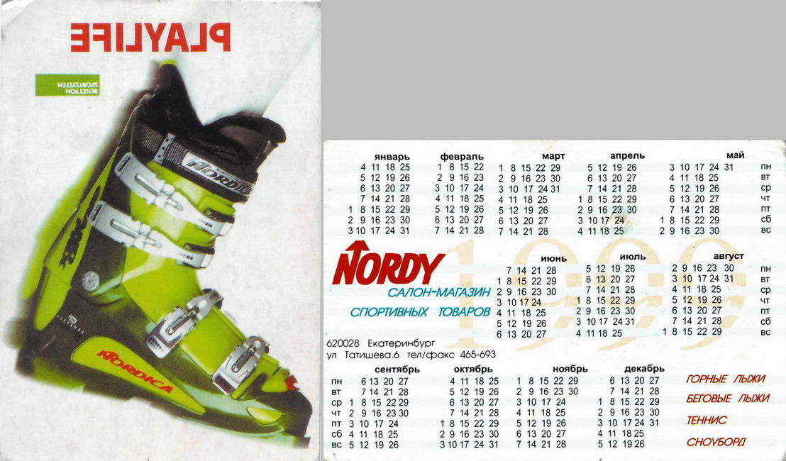 Карманный календарик "г.Екатеринбург. Салон-магазин спортивных товаров «NORDY». PLAYLIFE. 1999 г."
