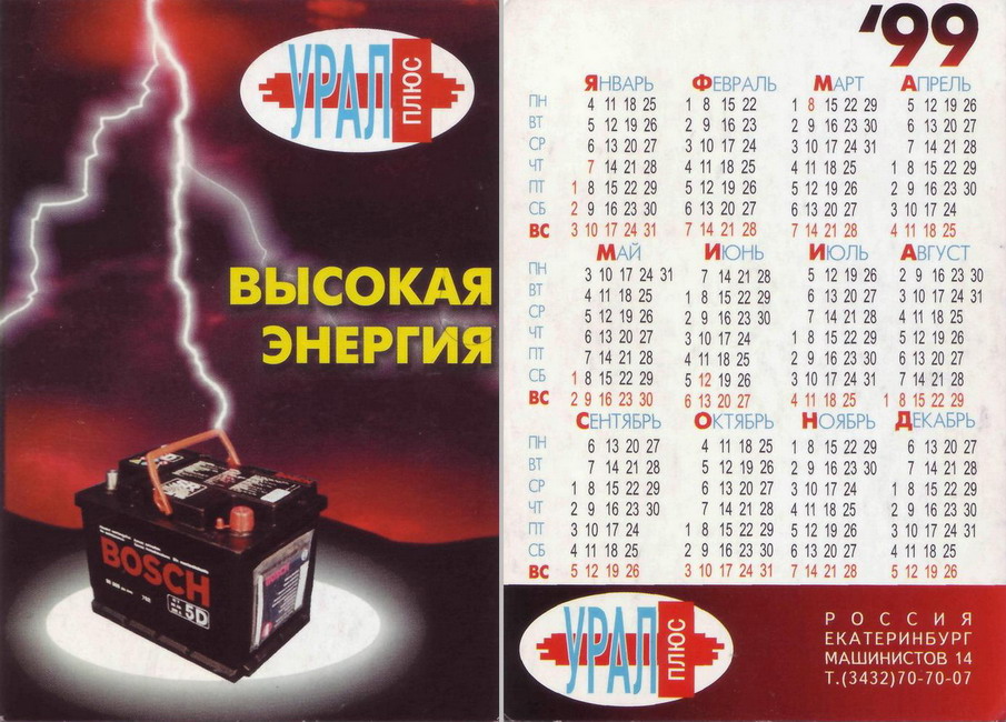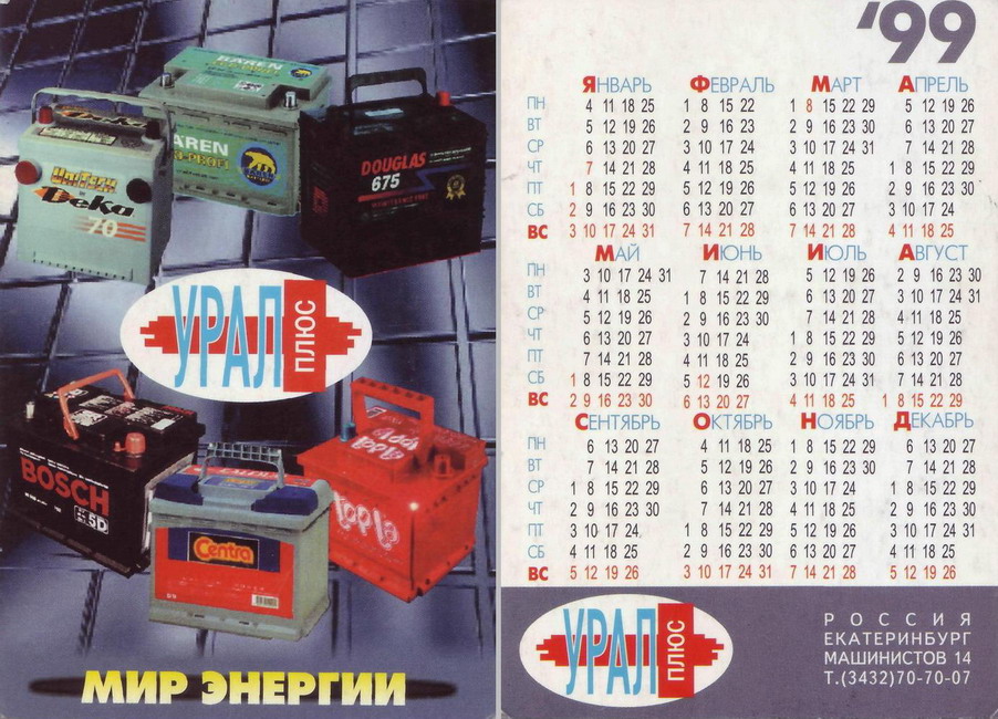 Карманный календарик "г.Екатеринбург. Магазин аккумуляторов «Урал Плюс». 1999 год."