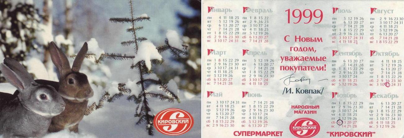 Карманный календарик "Супермаркет «Кировский». С Новым годом! 1999 г."