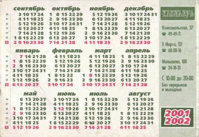 Серия карманных календариков сети магазинов канцелярских товаров "Канцлеръ". 2001-2002 гг.
