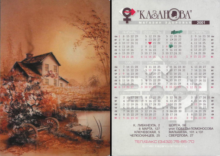 Карманный календарик "г.Екатеринбург. Сеть магазинов интимных товаров «Казанова». 2001 год."