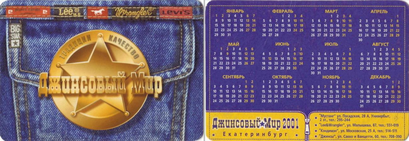 Карманный календарик "г.Екатеринбург. Сеть магазинов «Джинсовый мир». 2001 год."