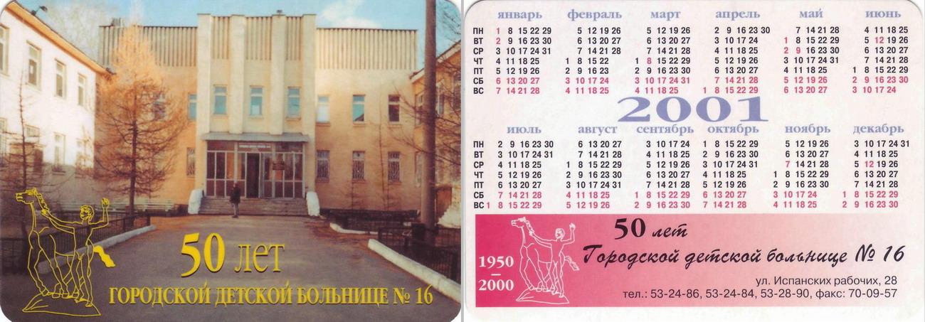 Карманный календарик "г.Екатеринбург. 50 лет городской детской больнице №16. 2001 год."