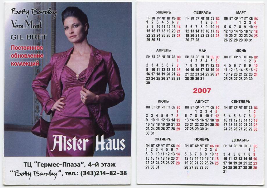 Карманный календарик "г.Екатеринбург. Бутик женской одежды «Betty Barclay». 2007 г."