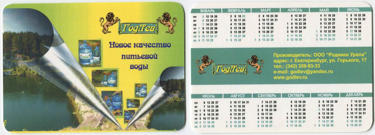 Карманный календарик "г.Екатеринбург. Питьевая вода «ГодЛев». 2009 г."