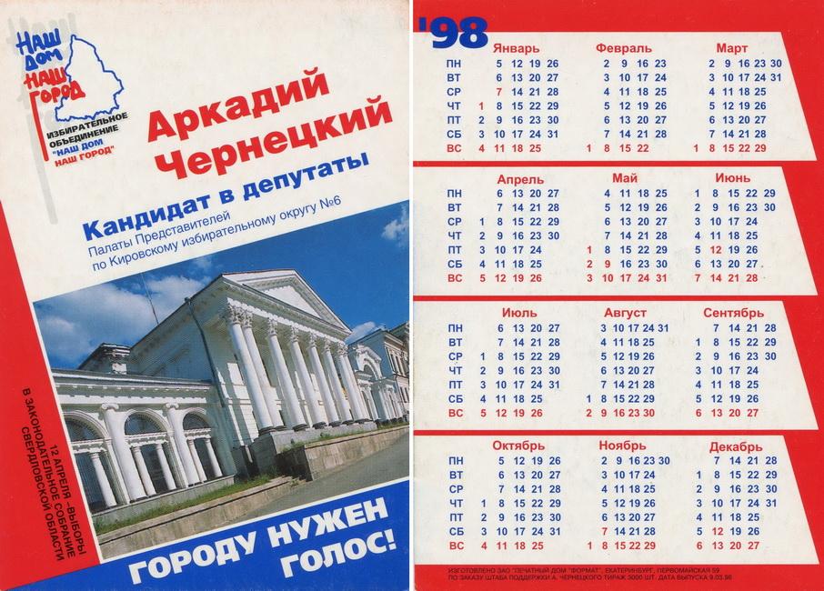 Карманный календарик "Выборы в Палату Представителей Законодательного собрания Свердловской области. Избирательный округ № 6. Чернецкий А.М. 1998 г."