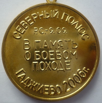 В ходе выполнения задач боевой службы в акватории Северного Ледовитого океана, АПКСН 9 сентября произвел пуск одной баллистической ракеты по полигону Чижа и 10 сентября осуществил всплытие в географической точке Северного Полюса. Памятные медали в честь этого события ![]() цветные: ![]() ещё одна: ![]() Памятные медали выпущены СРЗ "Нерпа", г.Снежногорск |