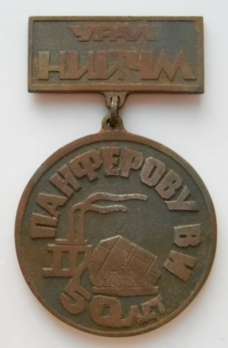 Самодельная подарочная медаль "УралНИИЧМ. Панферову В.И. 50 лет. От коллектива экспериментального цеха."