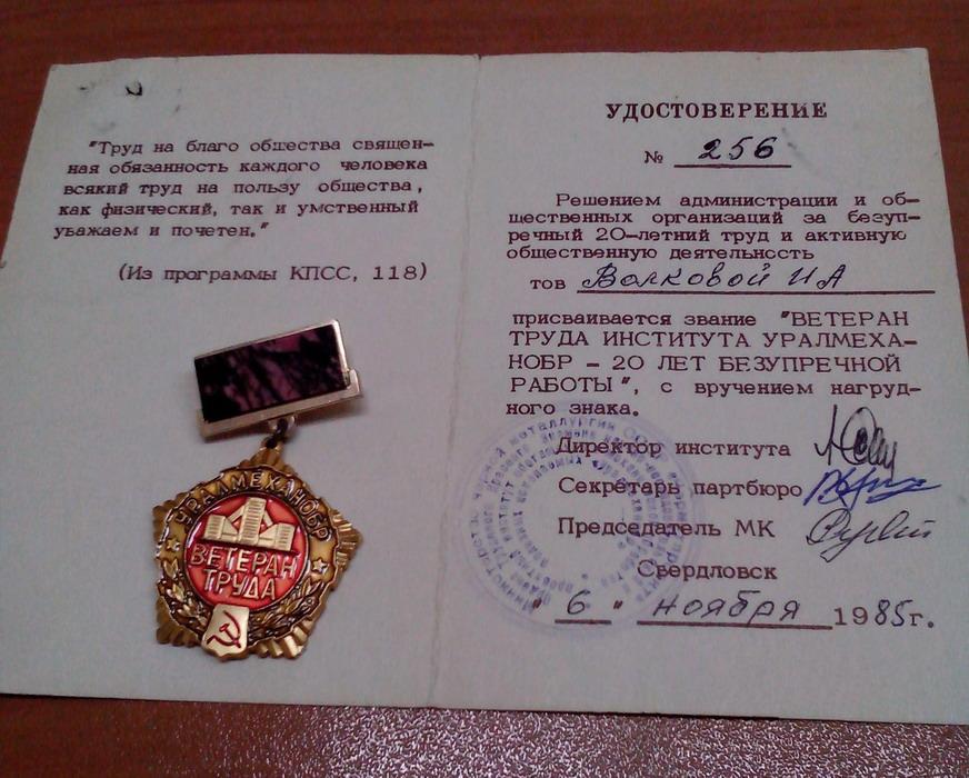 Значок и удостоверение "г.Свердловск. Уралмеханобр. Ветеран труда."