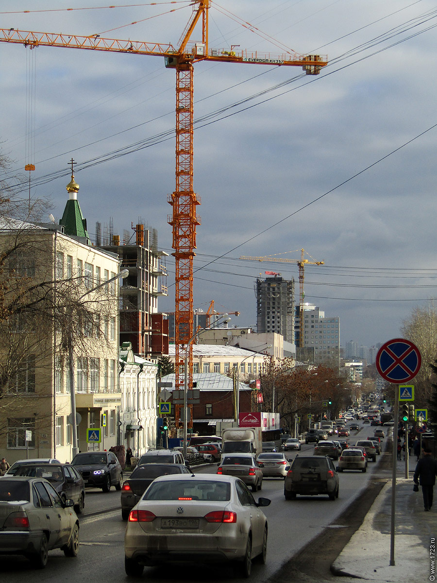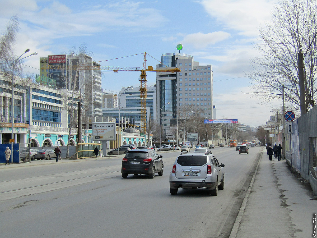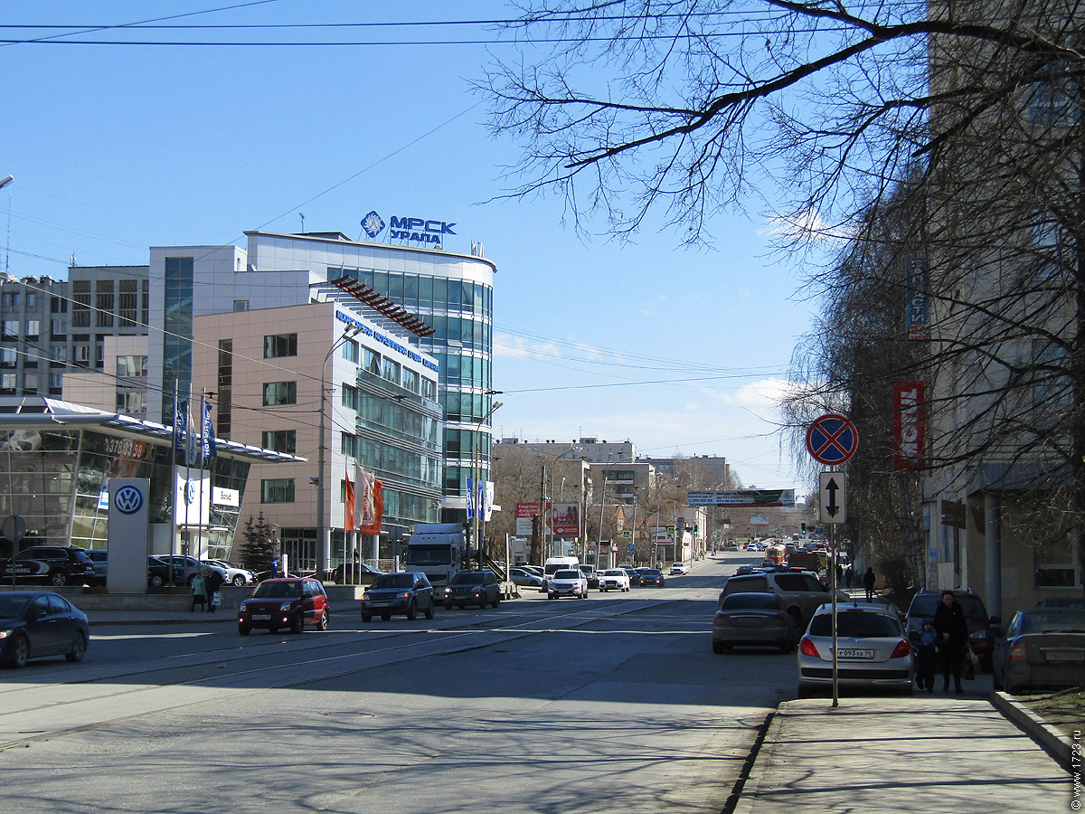 Слева автосалон VW (ул.Куйбышева, 81), за ним офисное здание "МРСК Урала" (Мамина Сибиряка, 140). ![]() |