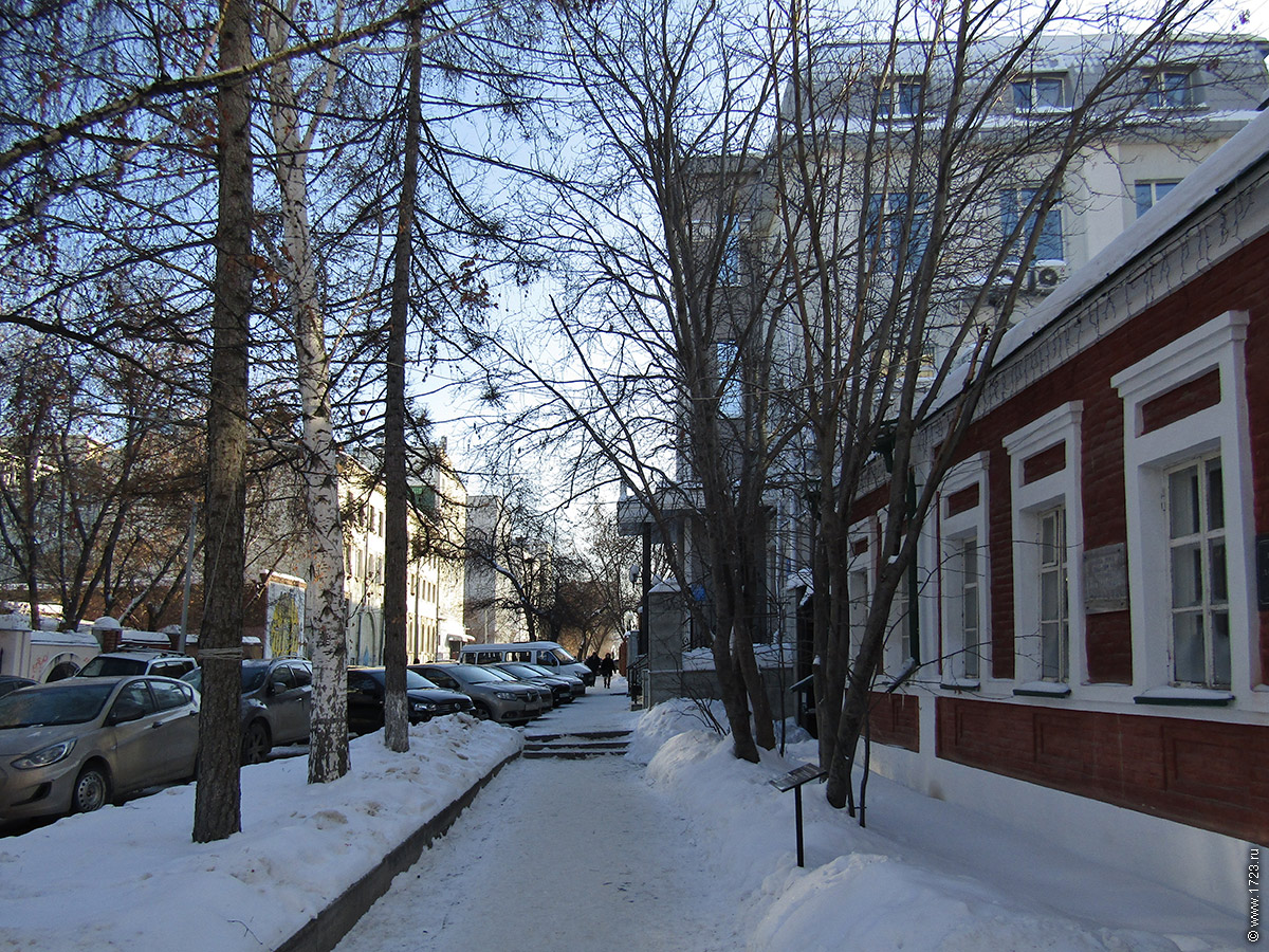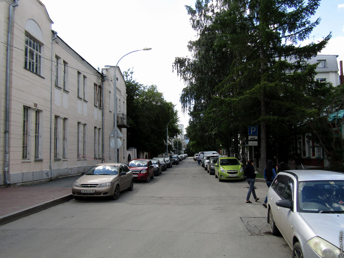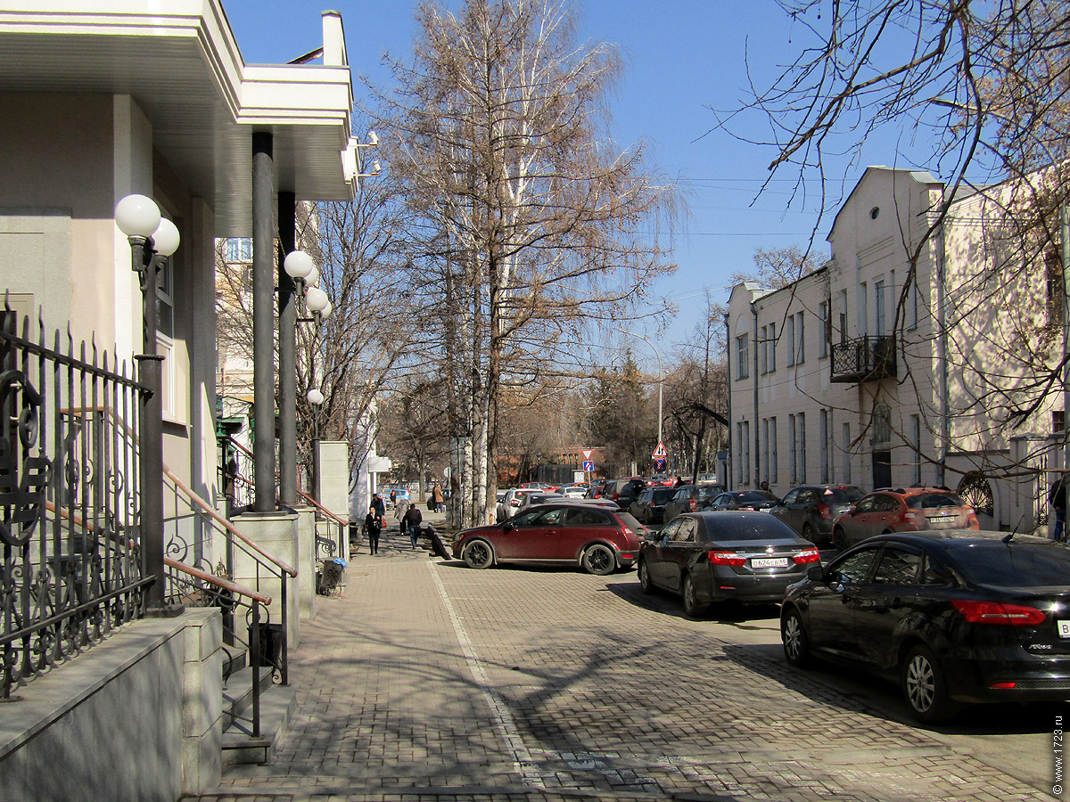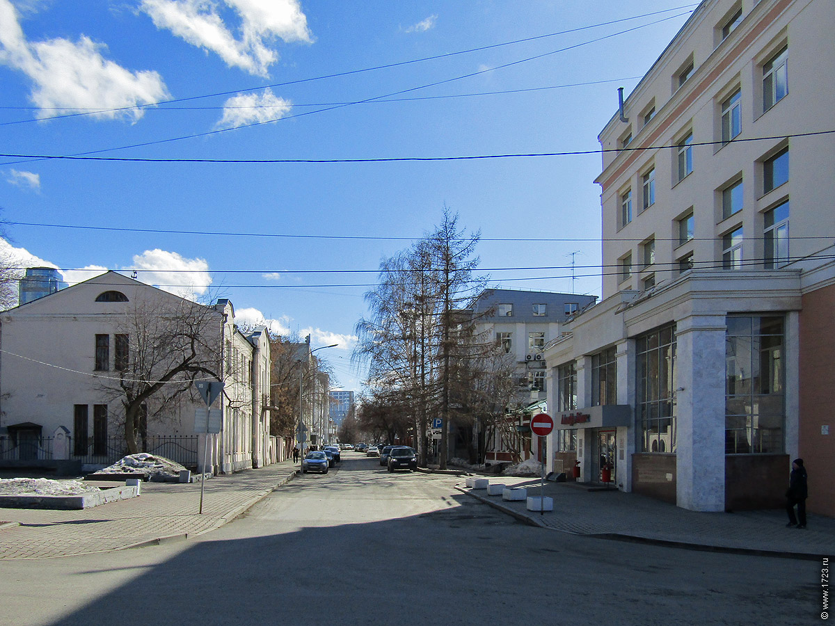 Слева Пушкина, 25 (Пенсионный фонд РФ по Свердловской области). ![]() Вид от Первомайской в сторону пер.Почтовый. Справа Дом-музей Д.Н.Мамина-Сибиряка (Пушкина, 27). ![]() |
