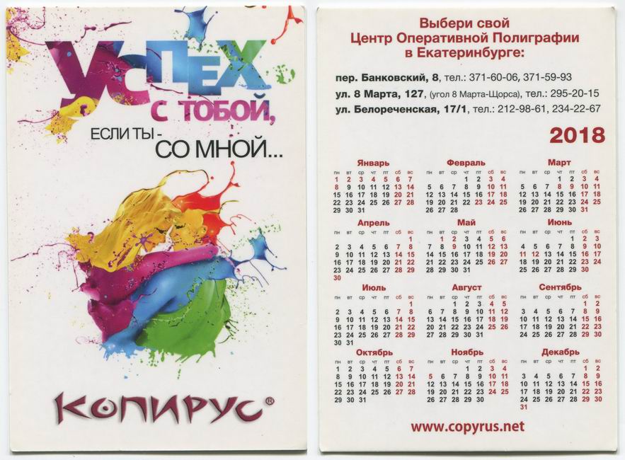 Карманный календарик "г.Екатеринбург. Центр оперативной полиграфии «Копирус». 2018 г."