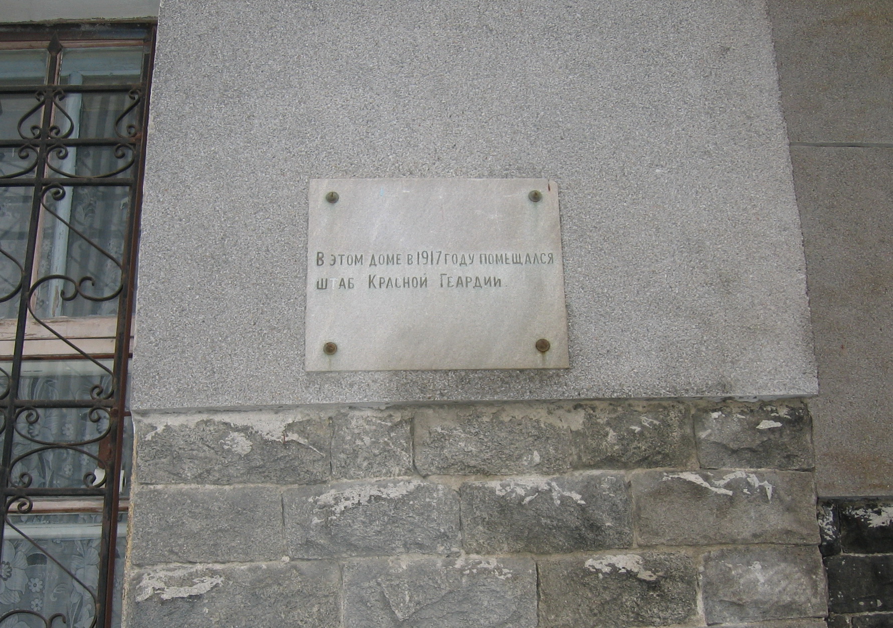 Мемориальная доска - "В этом доме в 1917 году помещался штаб Красной Гвардии.". Фото Елены Закамалдиной, кадрировано и уменьшено, 3 апреля 2006 года. ![]() |