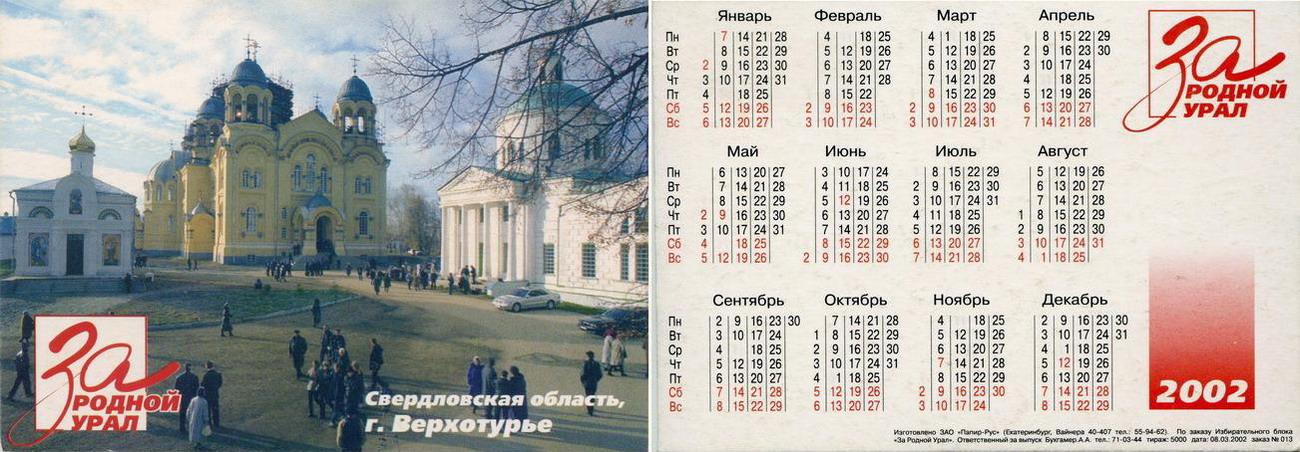 Карманный календарик "За родной Урал! Свердловская область. г.Верхотурье. 2002 г."