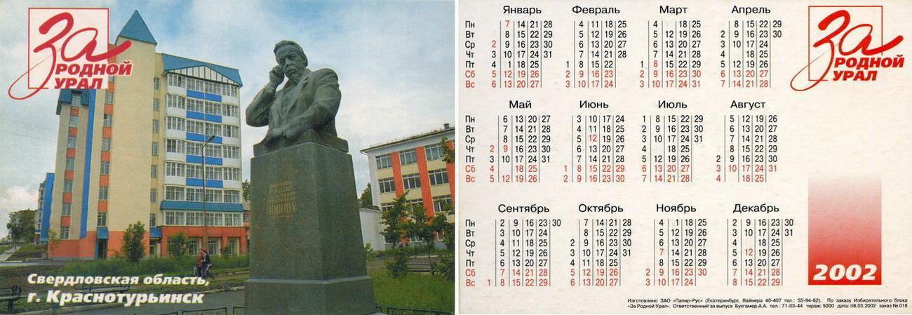 Карманный календарик "За родной Урал! Свердловская область. г.Краснотурьинск. 2002 г."