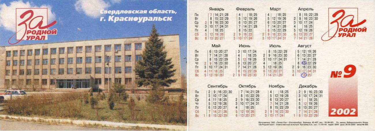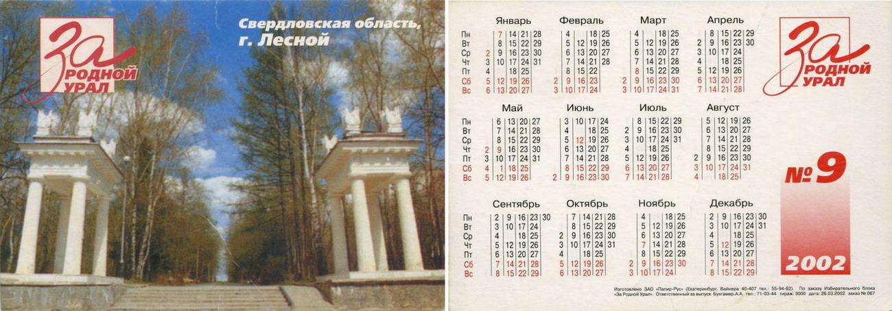 Карманный календарик "№9. За родной Урал! Свердловская область. 2002 г."