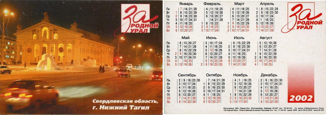 Карманный календарик "За родной Урал! Свердловская область. г.Нижний Тагил 2002 г."