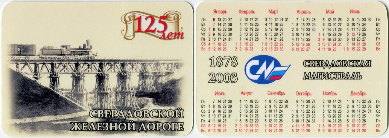 Карманный календарик "Свердловской железной дороге 125 лет. 2003 г."
