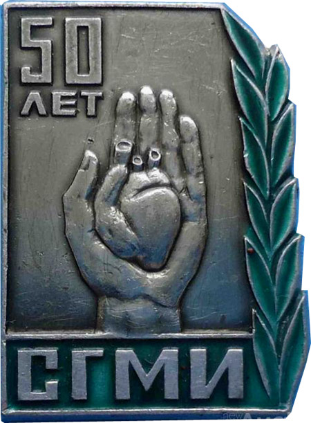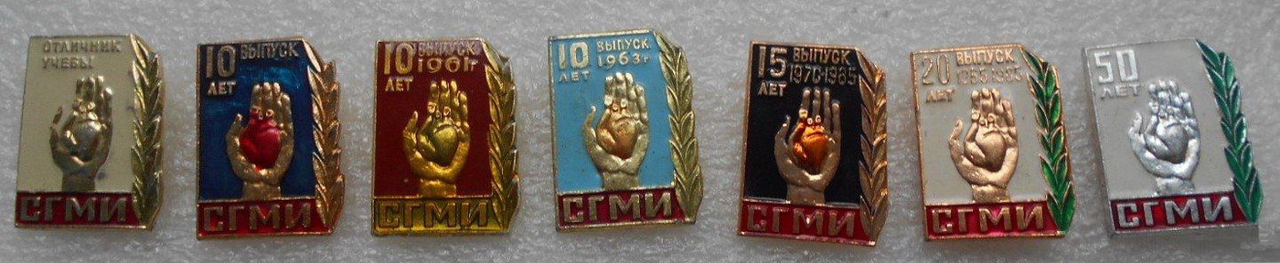 ![]() Dim96: Должен Вас огорчить уважаемый 1723 это значок не нашего вуза. Это ВУЗ Смоленска. В советский период кроме Свердловского медицинского института (СГМИ) были ещё Саратовский государственный медицинский институт (СГМИ) и Смоленский государственный медицинский институт (СГМИ). Вот ещё ряд подобных значков и их обратная сторона: ![]() ![]() Если посмотреть на клеймо производителя на обратной стороне значка, то мы увидим или СМЗ или САЗ это Смоленский машиностроительный завод или Смоленский авиационный завод (ранее СМЗ – сувенирный цех). Так что это значок Смоленского государственного медицинского института. |