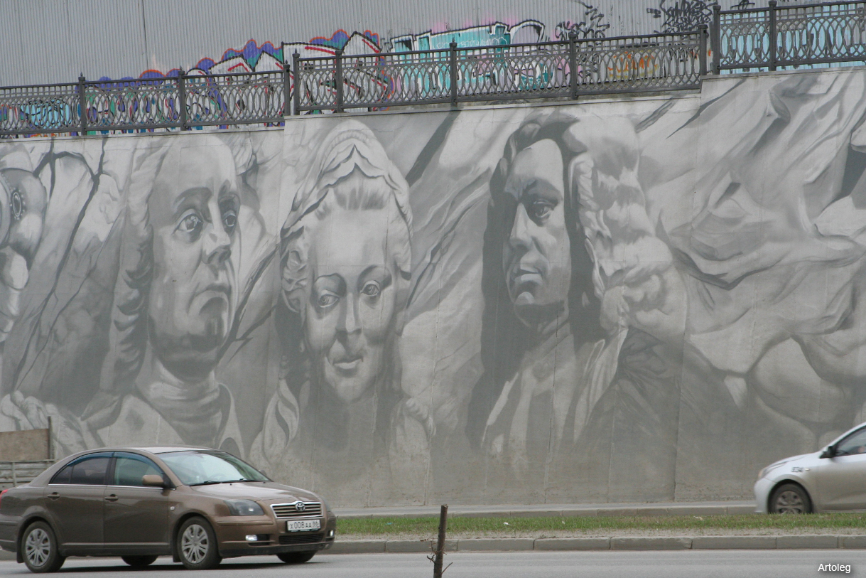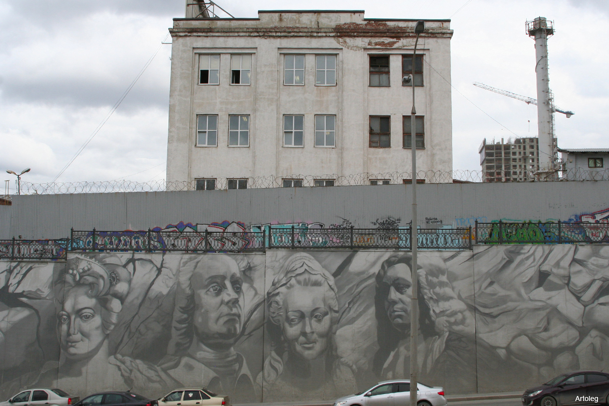 Мурал (огромное граффити), на котором изображены знаковые для города личности: Де Геннин и Татищев, а также императрицы Екатерина I и Екатерина II.
