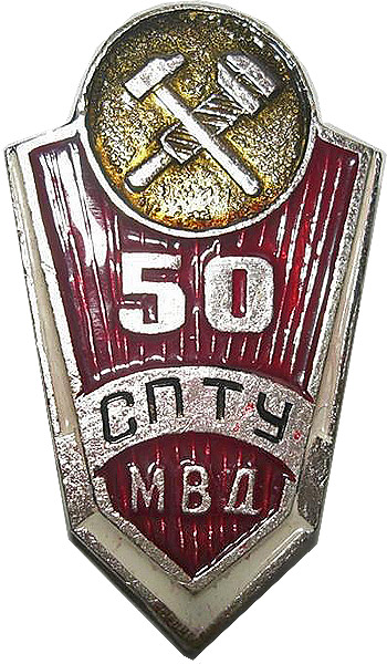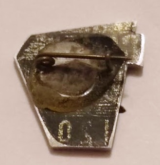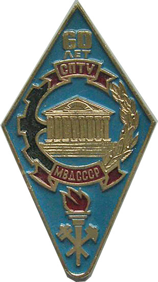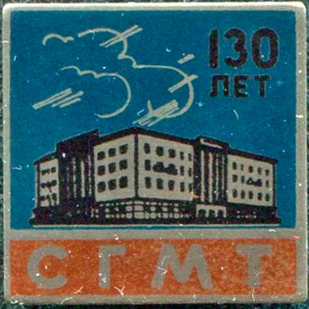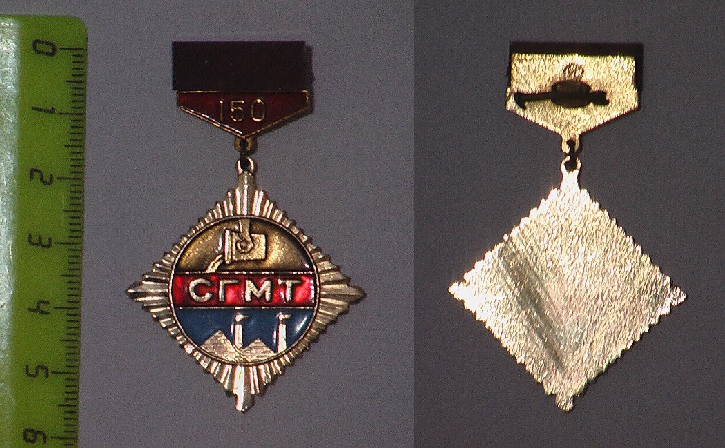 ![]() Материал: металл (алюминий?), камень; Крепление: булавка. СГМТ - Свердловский горно-металлургический техникум, ныне колледж им. И.И. Ползунова. |
