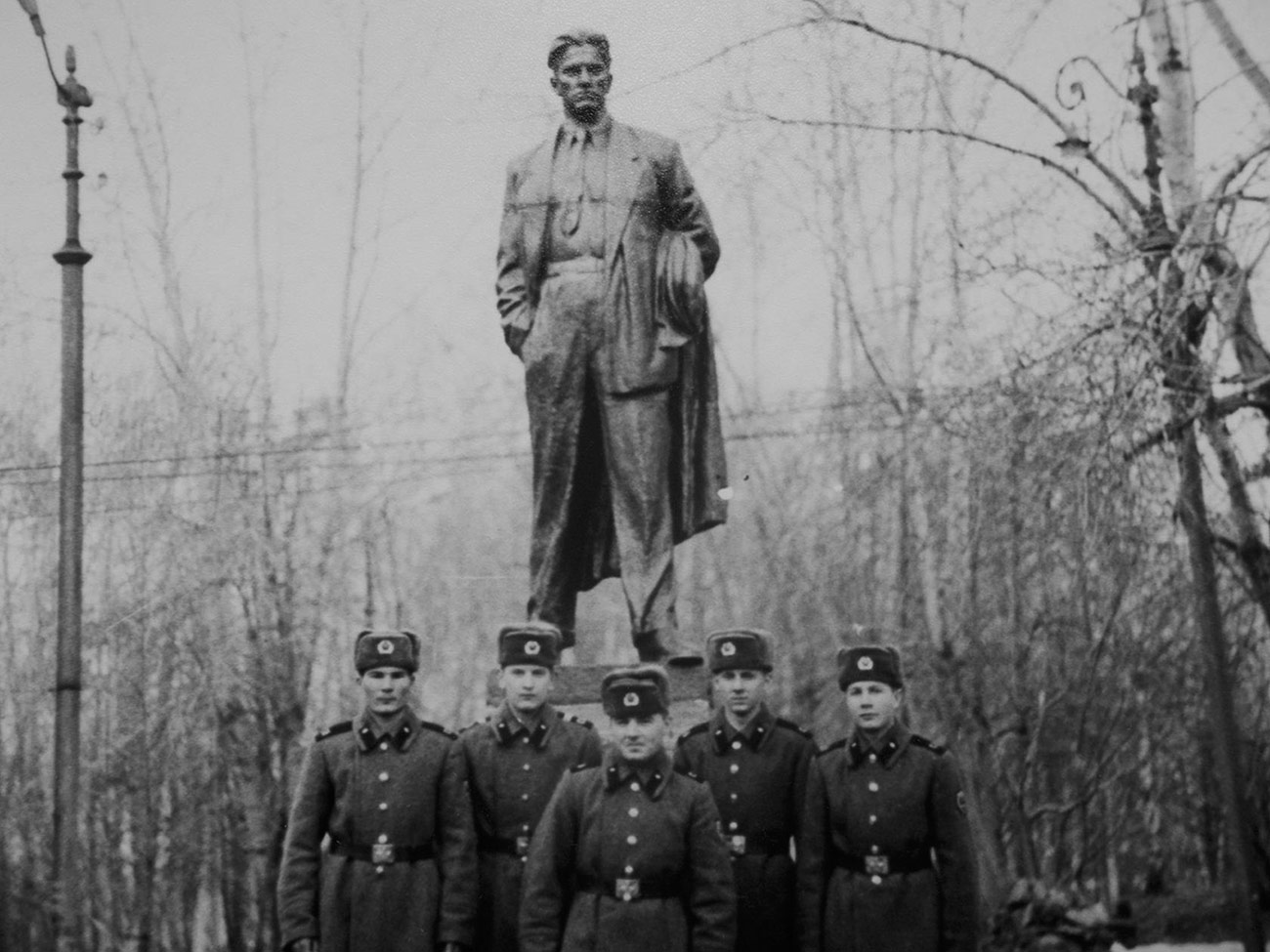 Группа военных на привокзальной площади. В источнике указано: 1955-1960 гг.