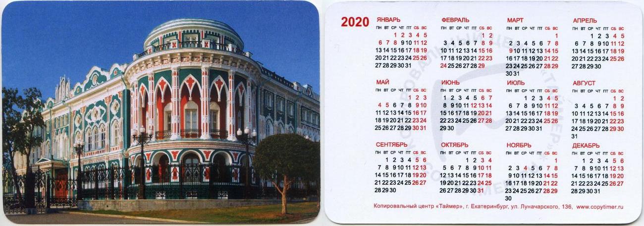 Карманный календарик "г.Екатеринбург. Копировальный центр «Таймер». Дом Н.И. Севастьянова. 2020 г."