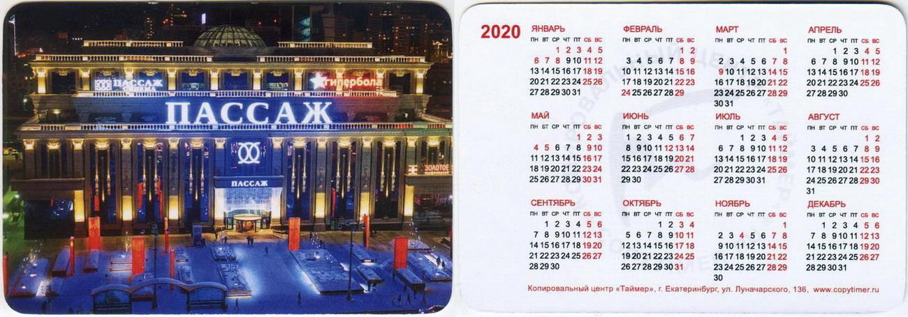 Карманный календарик "г.Екатеринбург. Копировальный центр «Таймер». Новый Пассаж. 2020 г."