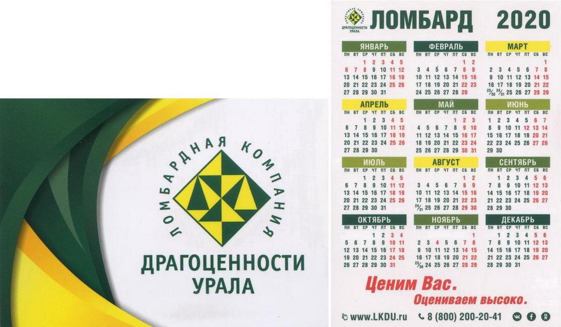 Карманный календарик "Ломбардная компания «Драгоценности Урала». 2020 г."