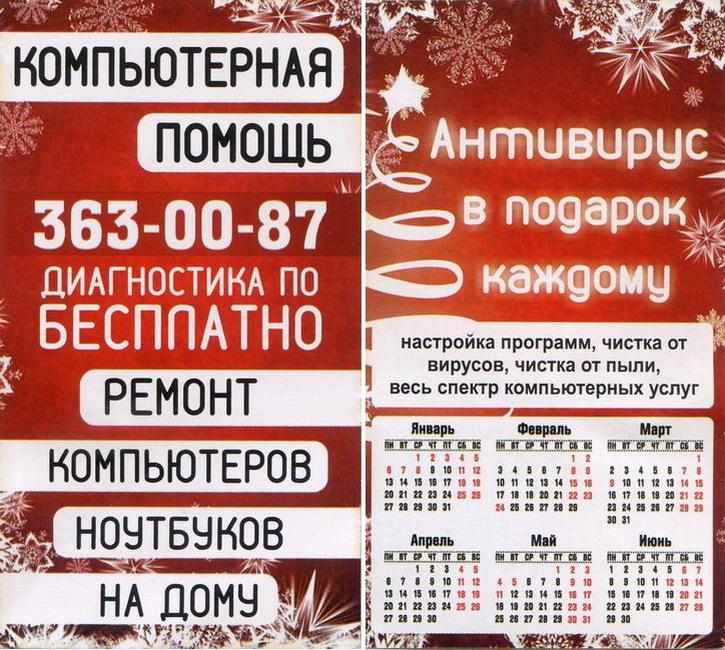 Календарик-визитка "г.Екатеринбург. Компьютерная помощь. 2020 г."