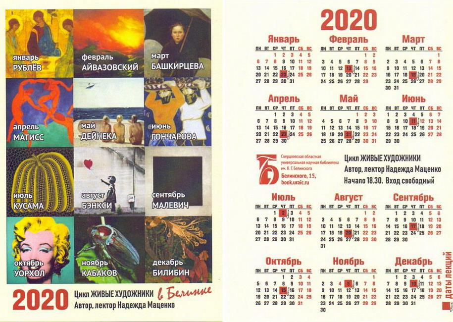 Карманный календарик "г.Екатеринбург. Цикл лекций «Живые художники». 2020 г."