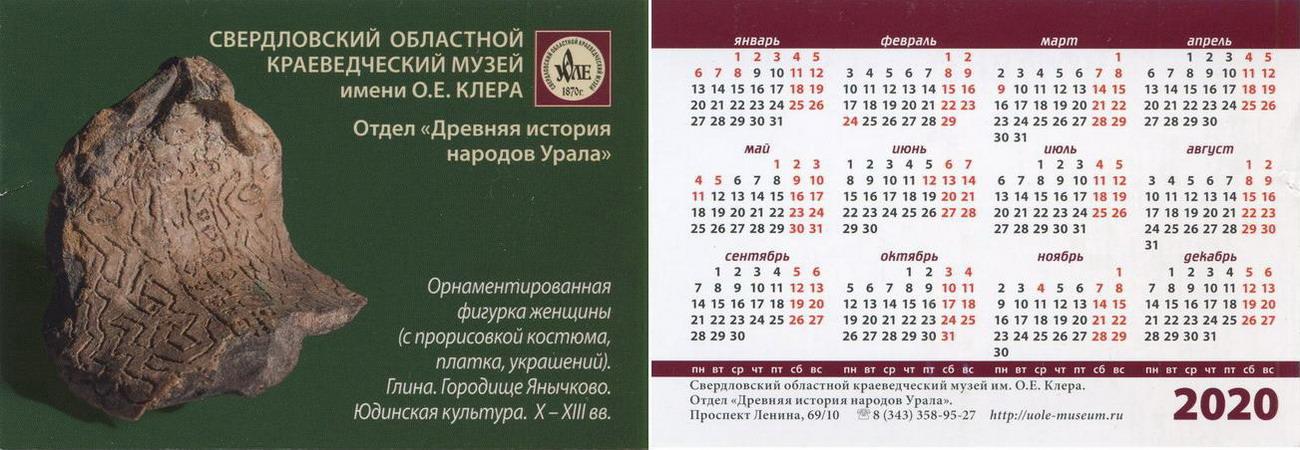 Карманный календарик "Свердловский областной краеведческий музей. Отдел древней истории народов Урала. Орнаментированная фигурка женщины. 2020 г."