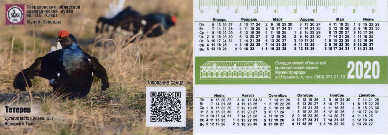 Карманный календарик "Свердловский областной краеведческий музей. Музей природы. Тетерев. 2020 г."